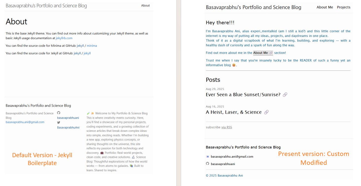 Here is the image showing the comparison between the boilerplate Jekyll site and my version:
