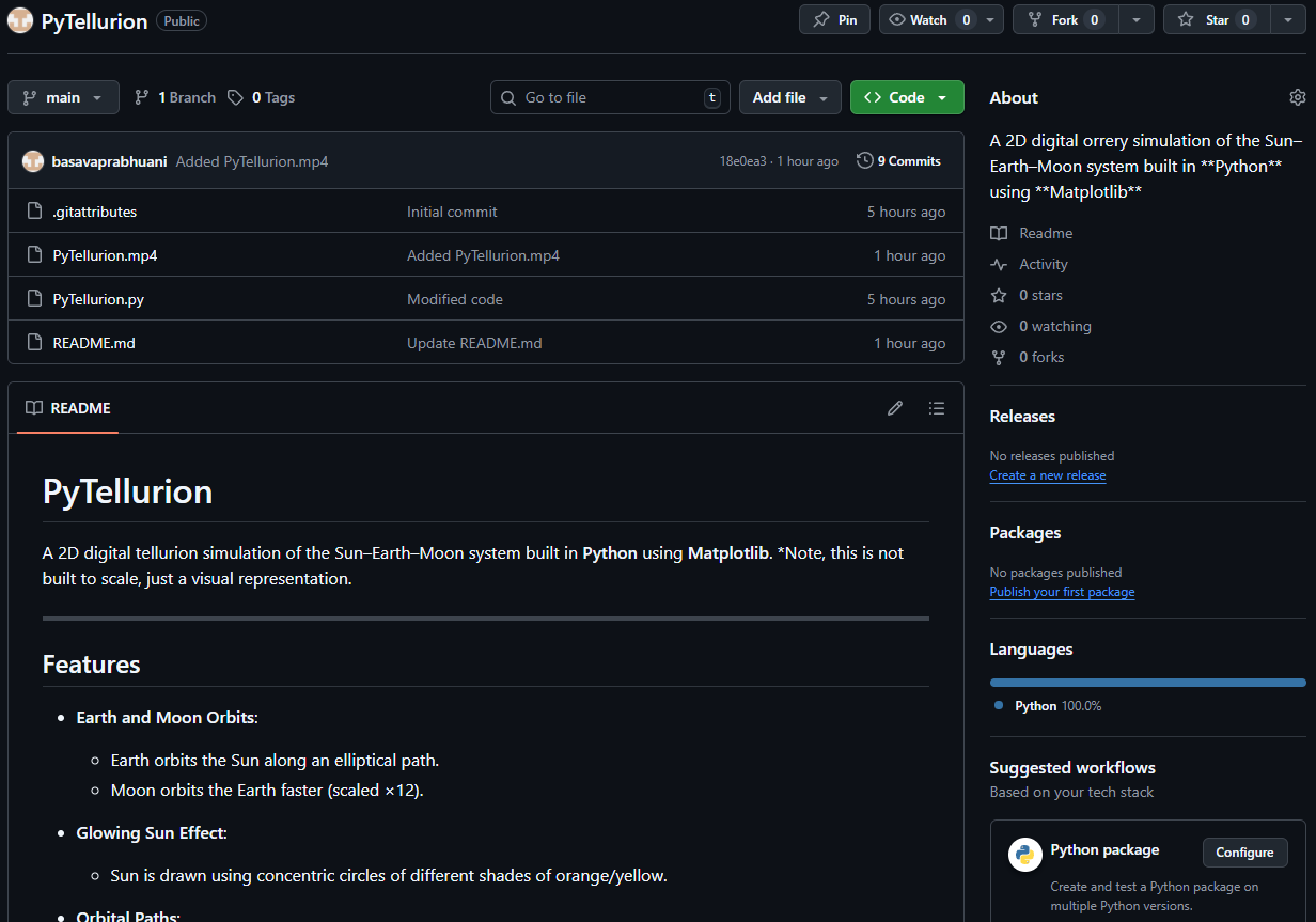 Working on PyTellurion turned out to be more challenging than it might look at first glance. On the surface, it’s just the Sun, Earth, and Moon moving around—but making the Moon orbit the Earth while the Earth orbits the Sun required careful use of math, coordinate transformations, and timing. It wasn’t only about writing code; it was about thinking through how to model orbital motion in a way that feels natural and accurate. I also realized how much of the “intelligence” in a project like this comes from balancing simplicity and detail—for example, deciding how fast the Moon should move compared to the Earth, or how to represent the Sun’s glow visually.